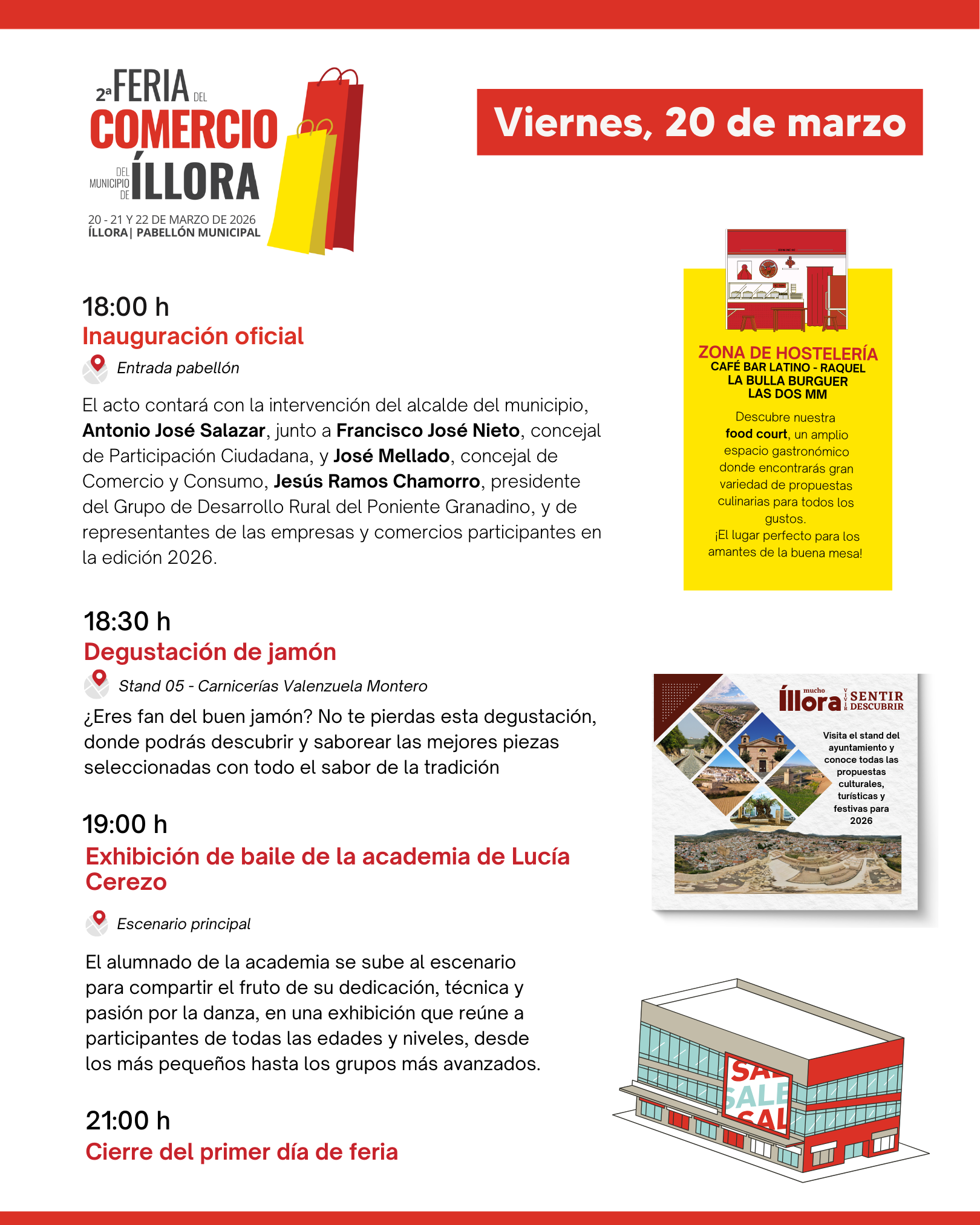 Viernes 20: Tras la inauguración oficial a las 17:00 h por parte del alcalde, Antonio José Salazar, la jornada arrancará con el arte de la Academia de Lucía Cerezo y una degustación de jamón a cargo de Carnicerías Valenzuela Montero.